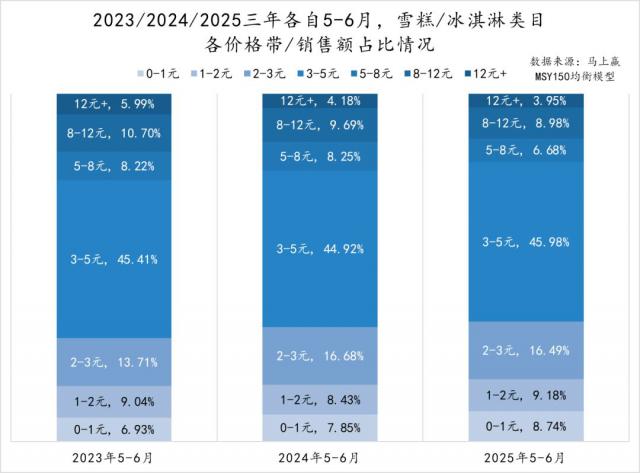 而从各价格带冰淇淋 / 雪糕的销售额占比来看,2023 年 -2025 年的 5-6 月,3-5 元的冰淇淋 / 雪糕是卖得最好的,销售额占比分别高达 45.41%、44.92% 和 45.97%。而价格高于 12 元的高价冰淇淋 / 雪糕的销售额占比在逐年下滑,从 2023 年的 5.99% 逐渐下滑至 2025 年的 3.95%。