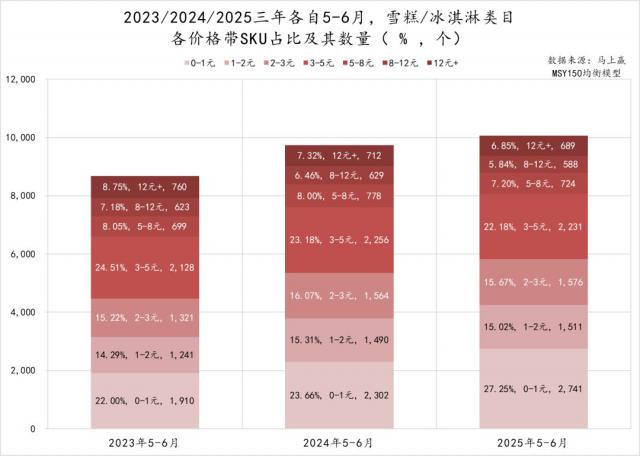 再从 sku 的数量来看,早在 2023 年,3-5 元的冰淇淋 / 雪糕是最多的,占比高达 24.51%,2024 年,0-1 元冰淇淋 / 雪糕的 sku 占比超过了 3-5 元的,为 23.66%,进入 2025 年,0-1 元冰淇淋 / 雪糕的占比更是升至 27.25%.