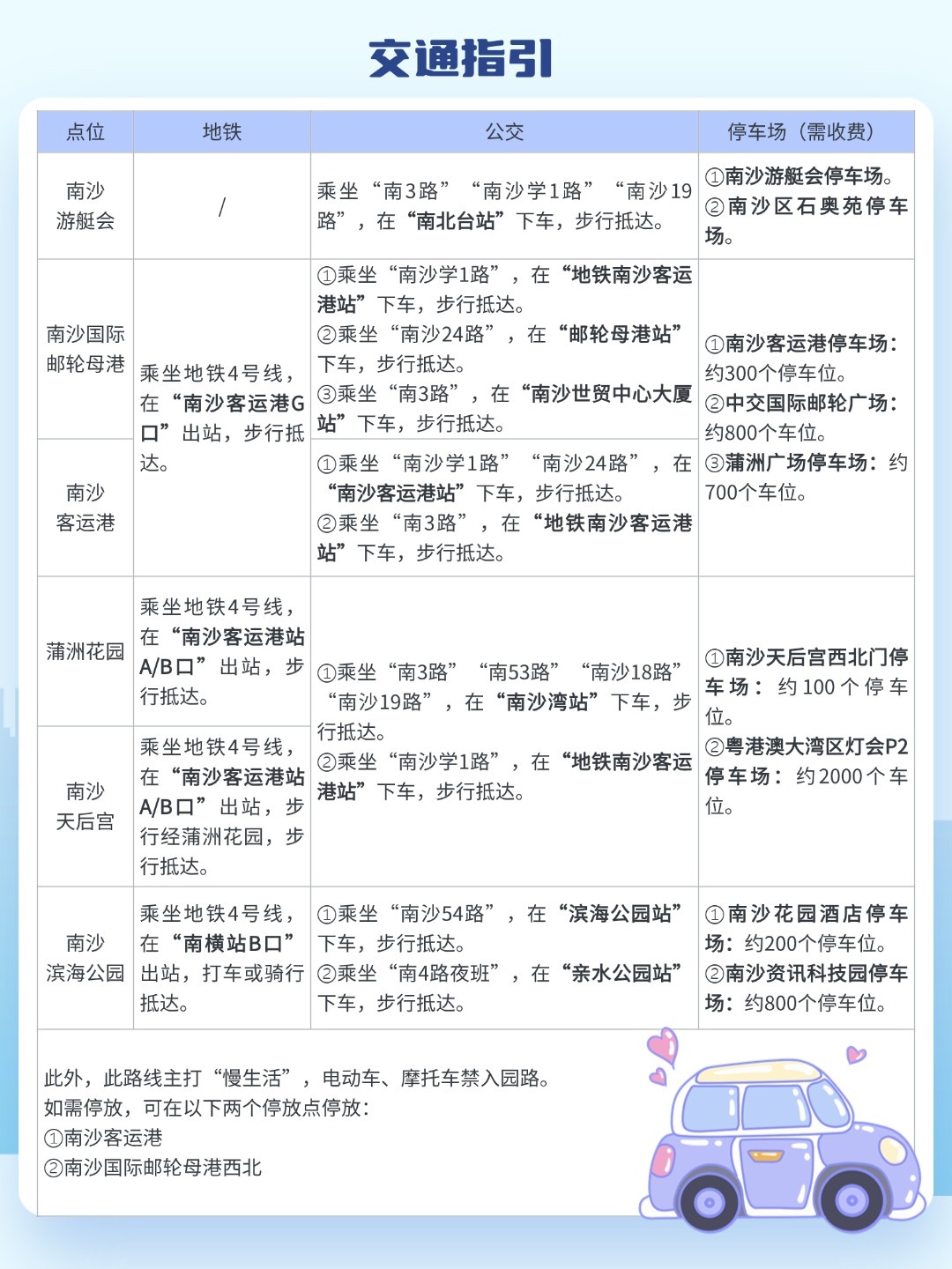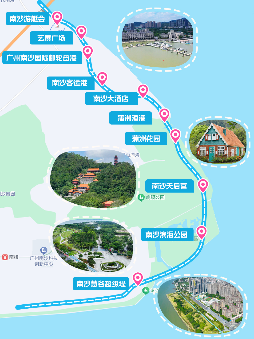 路线:南沙游艇会→艺展广场→南沙国际邮轮母港→南沙大酒店→蒲洲渔港→蒲洲花园→南沙天后宫