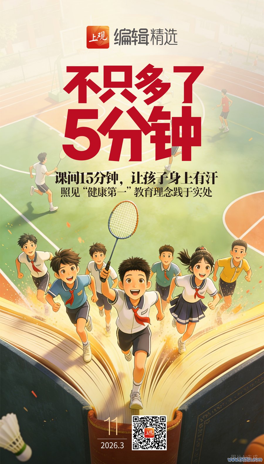总而言之,学生健康是件大事,从课间15分钟到每天体育活动2小时,折射的是人才观、成才观、教育观的深刻变革,需要各方齐抓共管、形成合力、共同推进。
